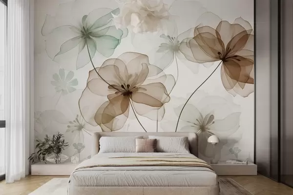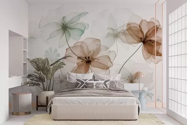 Fotomurales Flores translúcidas con pétalos marrones y verdes, tallos largos, fondo claro, colores suaves, diseño floral con textura Nr. w09529