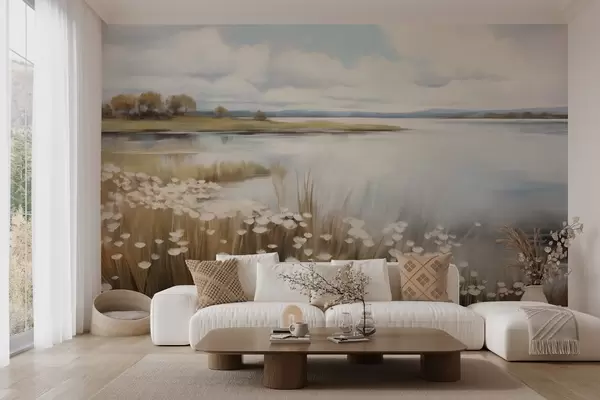 Fotomurales Paisaje con textura, campo de flores blancas y hierba alta, un lago al fondo, una colina cubierta de hierba con árboles, colores suaves Nr. w09530