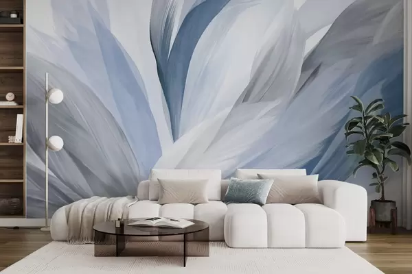 Fotomurales Plumas abstractas con textura en azul, blanco y gris y varios tonos, superpuestas sobre un fondo blanco. Nr. w09531v1