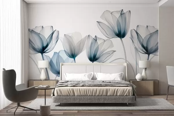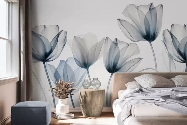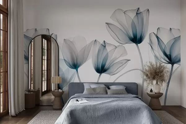 Fotomurales Flores de tulipán translúcidas de color azul y blanco con tallos largos, sobre un fondo claro, delicadas y con textura, arte floral Nr. w09538