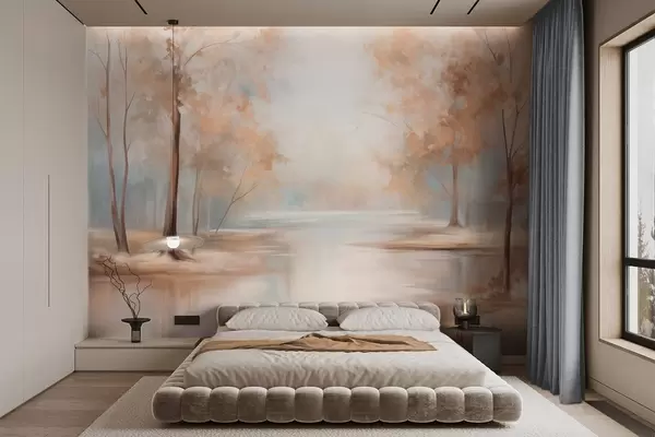 Fotomurales Paisaje otoñal con árboles y un río, colores suaves, atmósfera ligera y aireada, escena pacífica y tranquila Nr. w09541