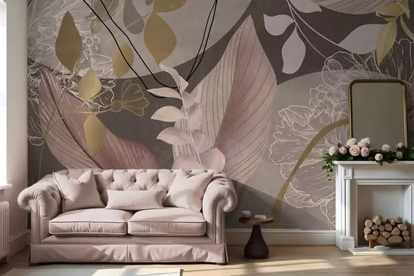 Fotomurales Estampado floral abstracto con hojas grandes en tonos rosa apagado y marrón, con finas líneas negras y contornos florales blancos Nr. w09544