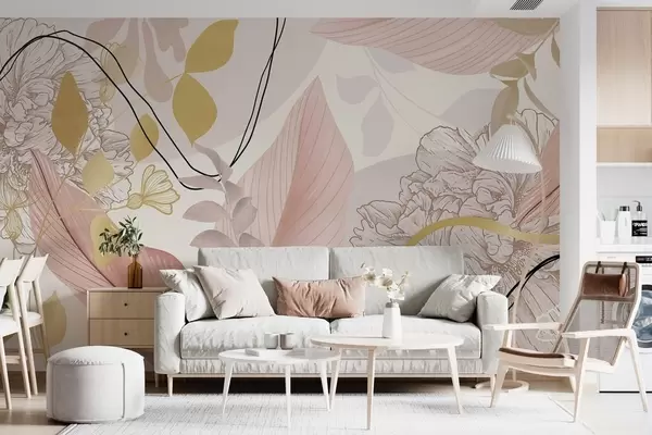 Fotomurales Estampado floral abstracto con hojas grandes en tonos rosa apagado, amarillo con finas líneas negras y contornos florales blancos Nr. w09544v1