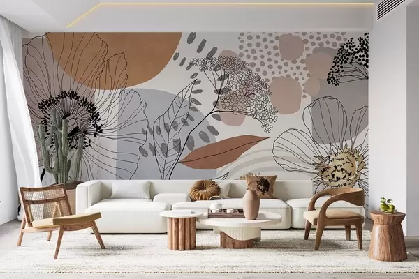 Fotomurales Estampado abstracto con textura floral, flores de trazo fino, hojas y formas orgánicas en tonos apagados de marrón, beige y gris Nr. w09548