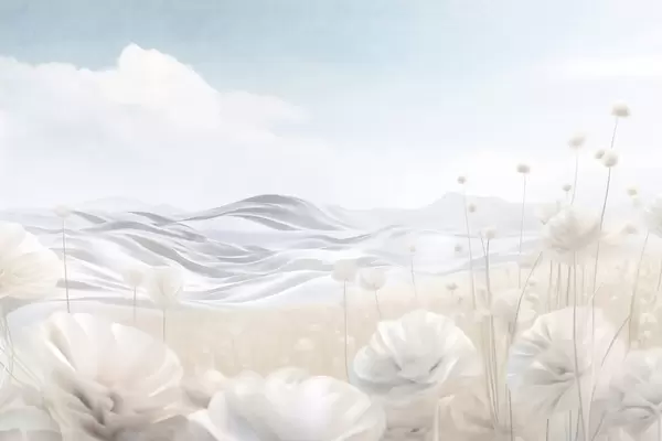 Fotomurales Campo texturizado de amapolas cremosas con colinas onduladas bajo un cielo azul pálido con nubes suaves, colores pastel. Nr. w09553