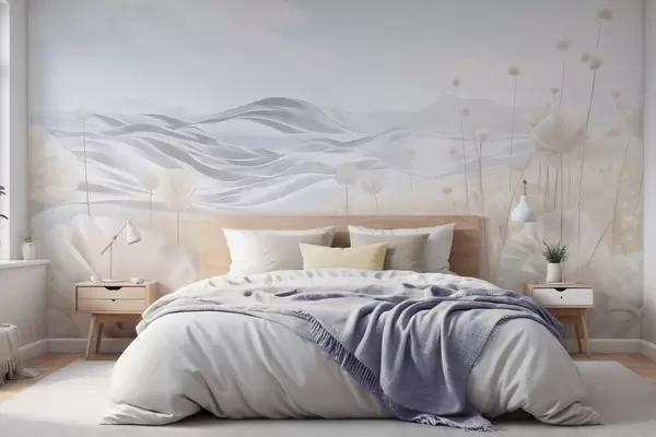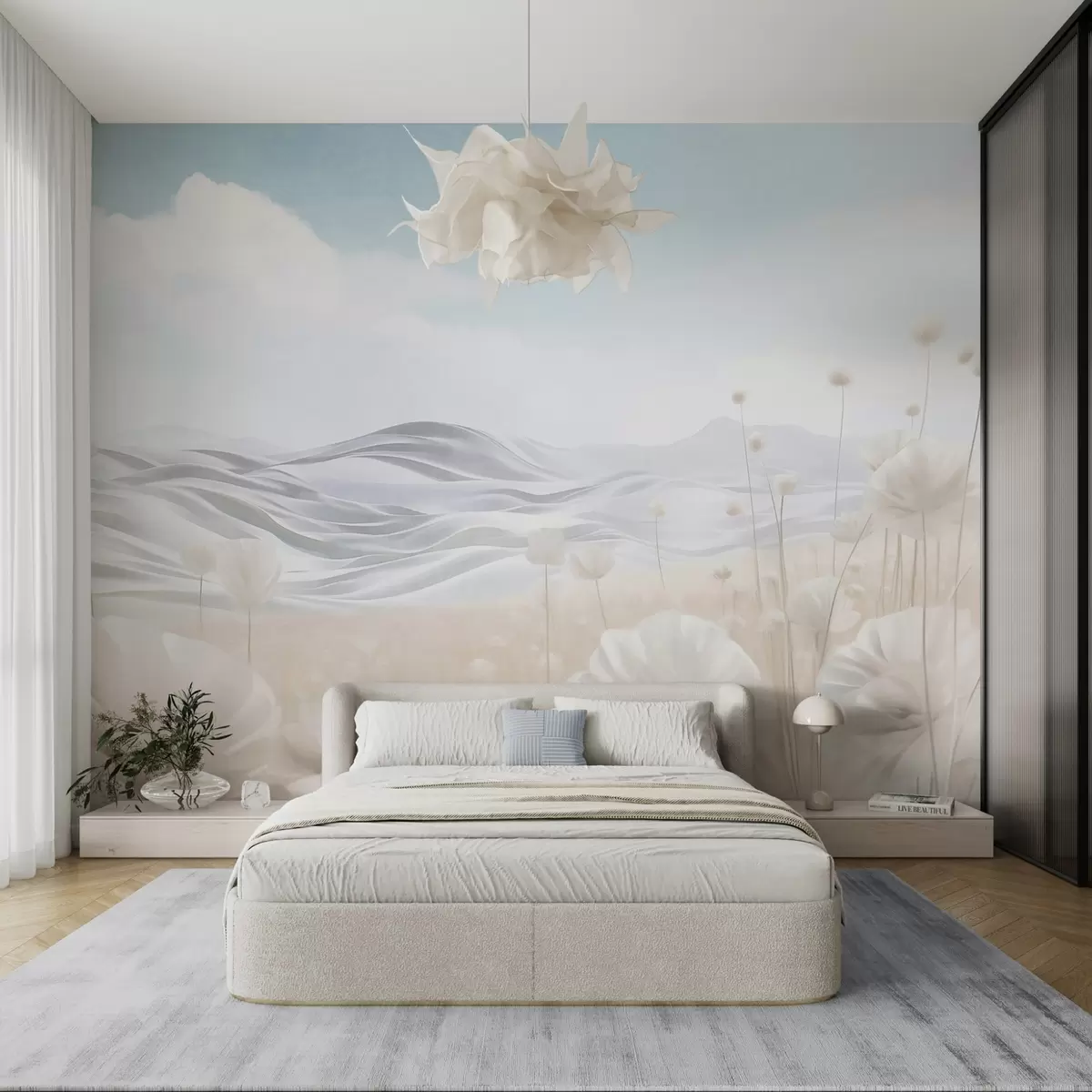Fotomurales Campo texturizado de amapolas cremosas con colinas onduladas bajo un cielo azul pálido con nubes suaves, colores pastel Nr. w09553