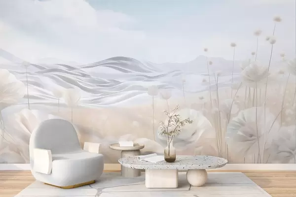 Fotomurales Campo texturizado de amapolas cremosas con colinas onduladas bajo un cielo azul pálido con nubes suaves, colores pastel Nr. w09553