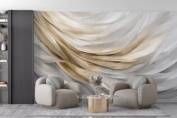 Fotomurales Plumas abstractas con textura en blanco, gris y amarillo, creando un patrón fluido y en capas sobre un fondo claro Nr. w09557