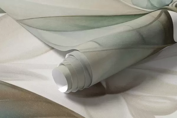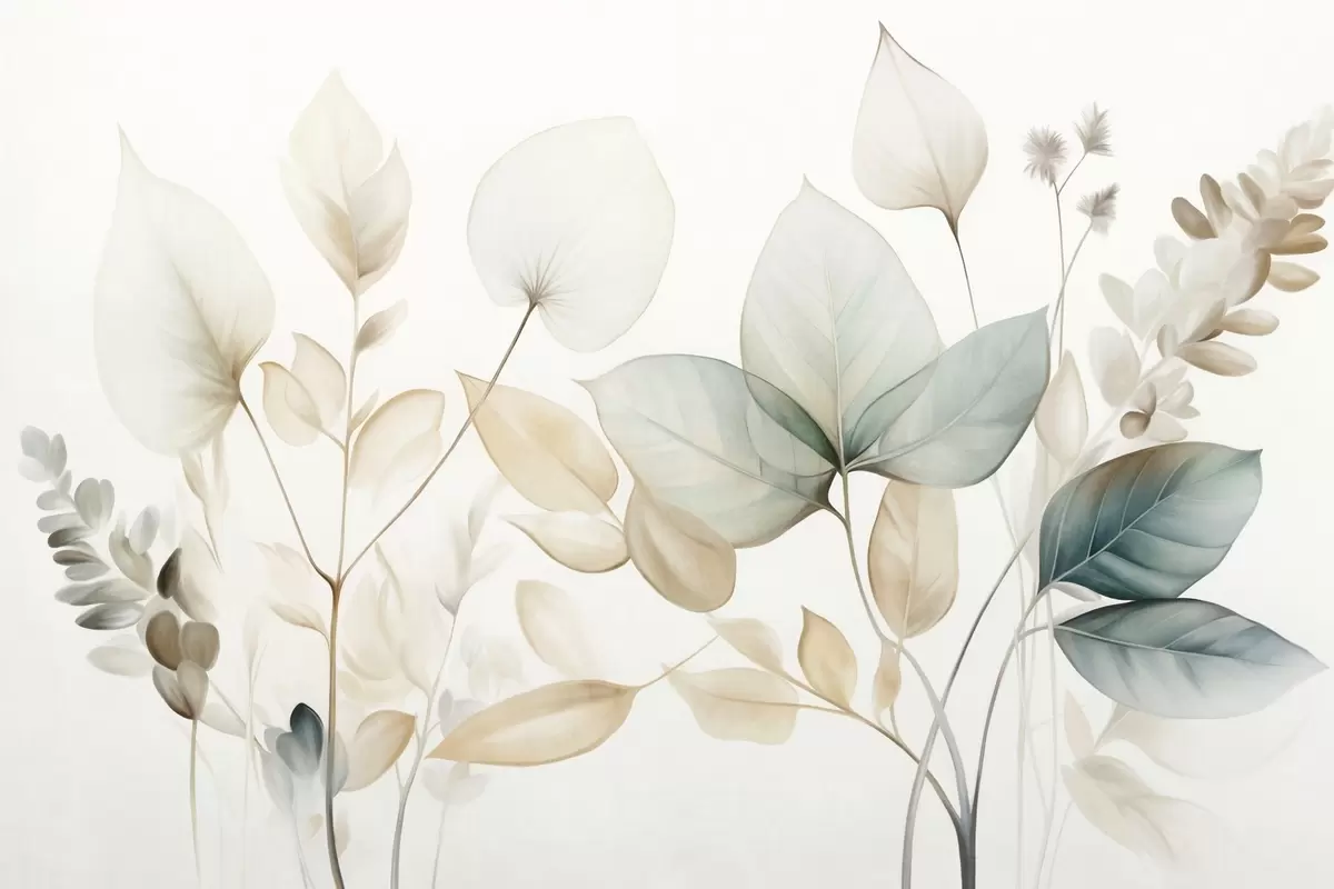 Fotomurales Hojas translúcidas con textura en tonos apagados de beige y verde azulado, con tallos delicados sobre un fondo suave y claro Nr. w09583