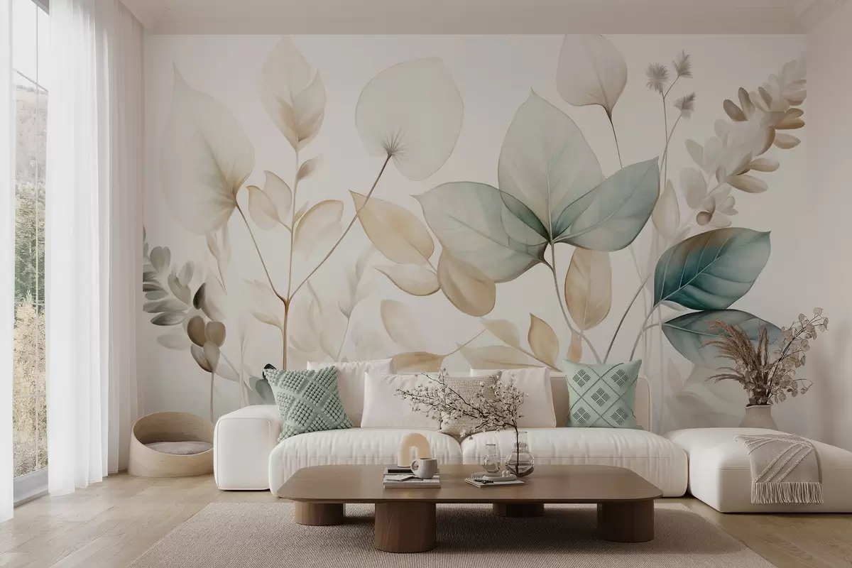 Fotomurales Hojas translúcidas con textura en tonos apagados de beige y verde azulado, con tallos delicados sobre un fondo suave y claro Nr. w09583