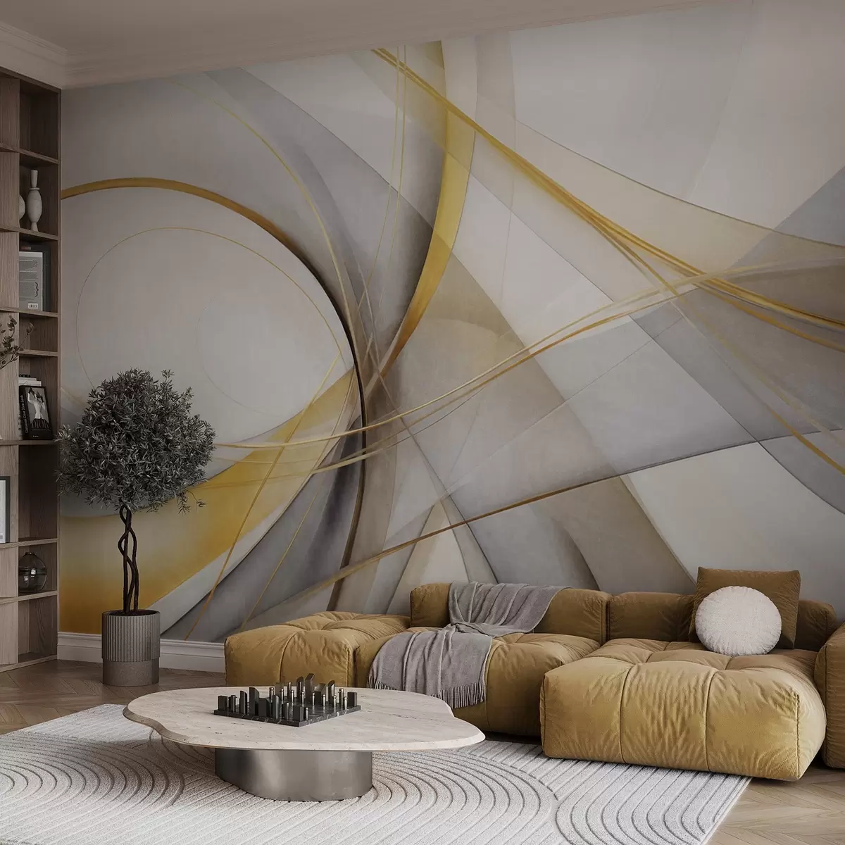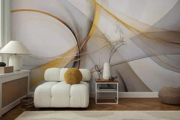 Fotomurales Líneas abstractas fluidas en amarillo y blanco sobre fondo gris, con sensación de movimiento y profundidad, arte moderno Nr. w09587