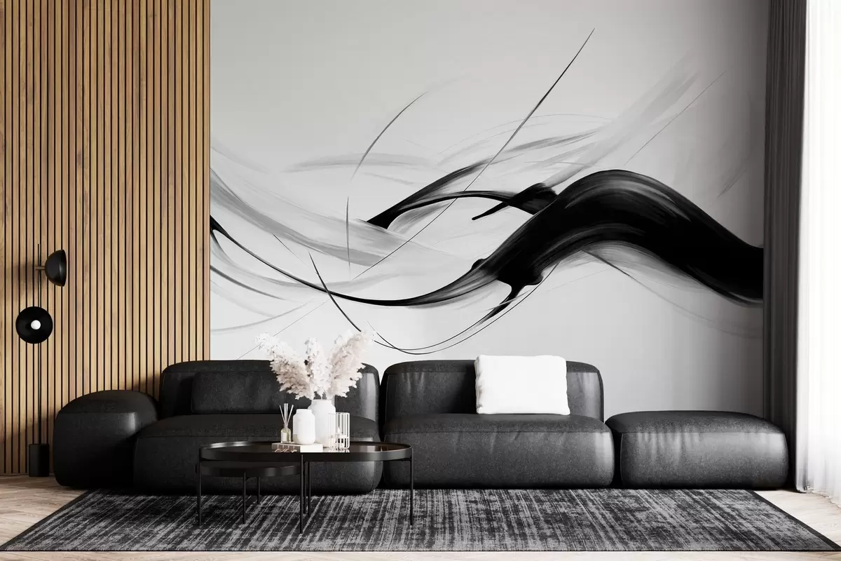 Fotomurales Pinceladas abstractas en blanco y negro con líneas finas que crean un diseño moderno sobre un fondo claro. Nr. w09605