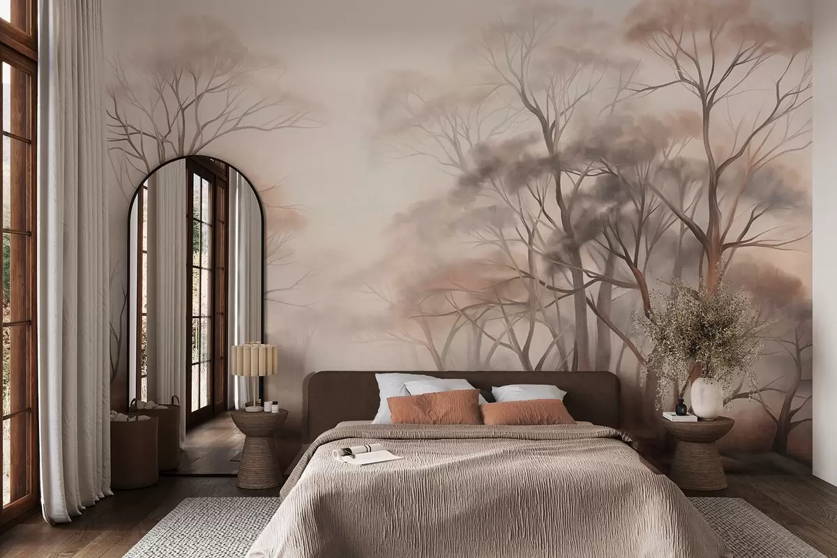 Fotomurales Árboles con textura en un bosque brumoso, paisaje neblinoso con colores apagados y suave iluminación. Nr. w09609