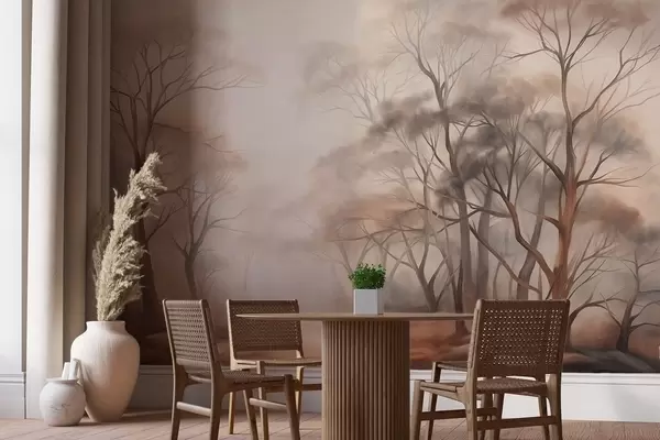 Fotomurales Árboles con textura en un bosque brumoso, paisaje neblinoso con colores apagados y suave iluminación. Nr. w09609