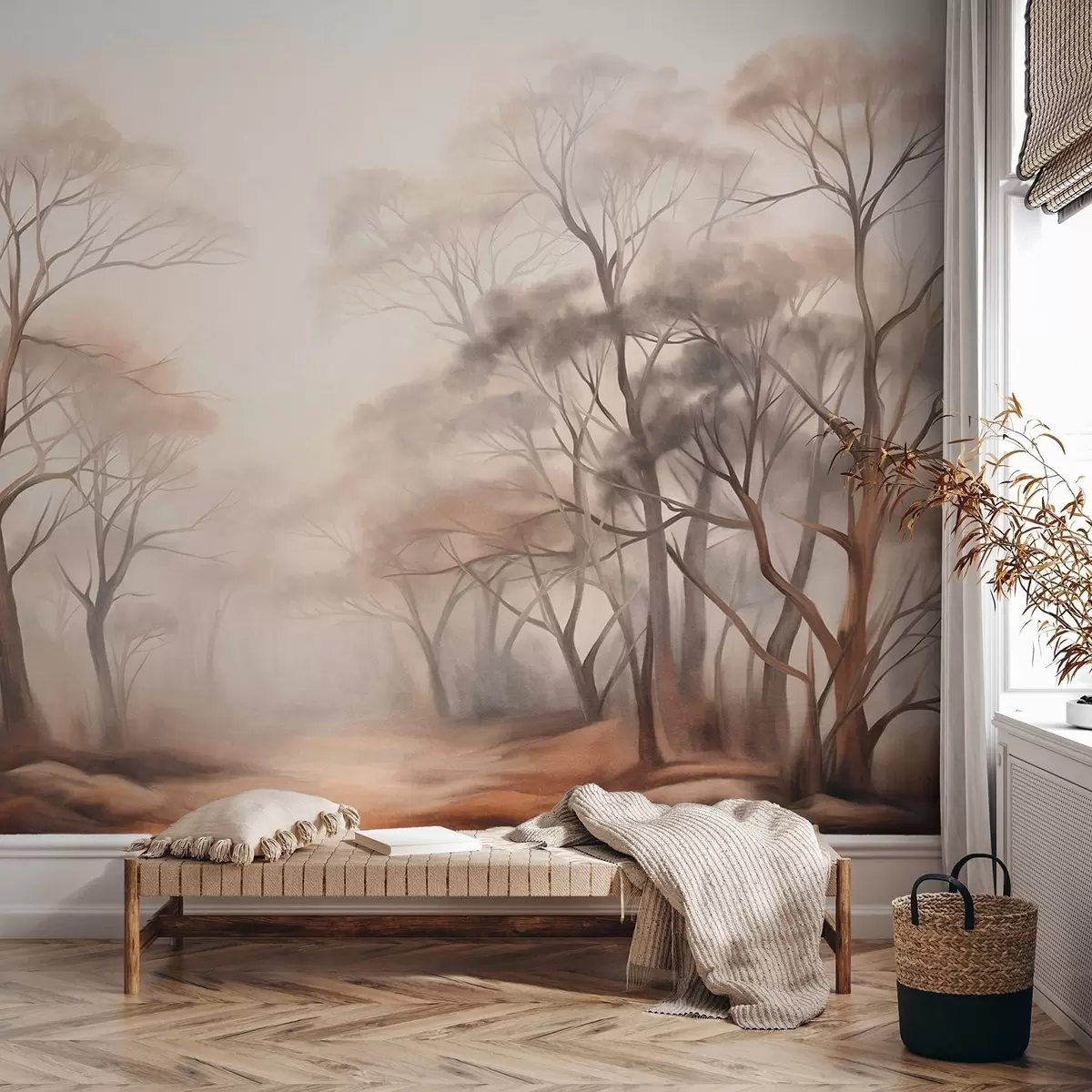 Fotomurales Árboles con textura en un bosque brumoso, paisaje neblinoso con colores apagados y suave iluminación. Nr. w09609