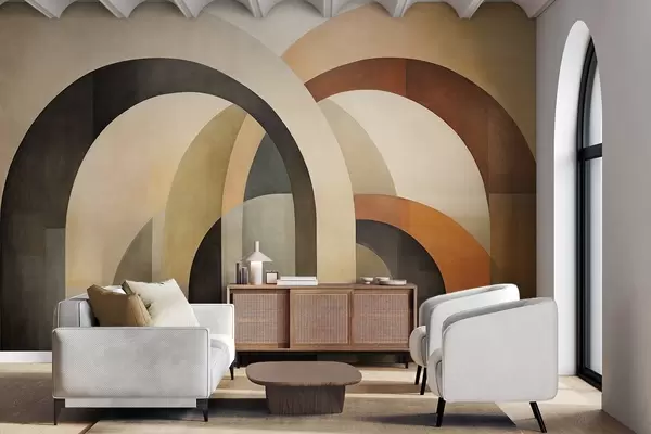 Fotomurales Arcos geométricos abstractos con textura en tonos tierra de beige, marrón y gris, un diseño arquitectónico moderno en capas. Nr. w09611