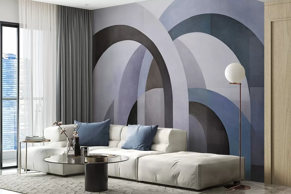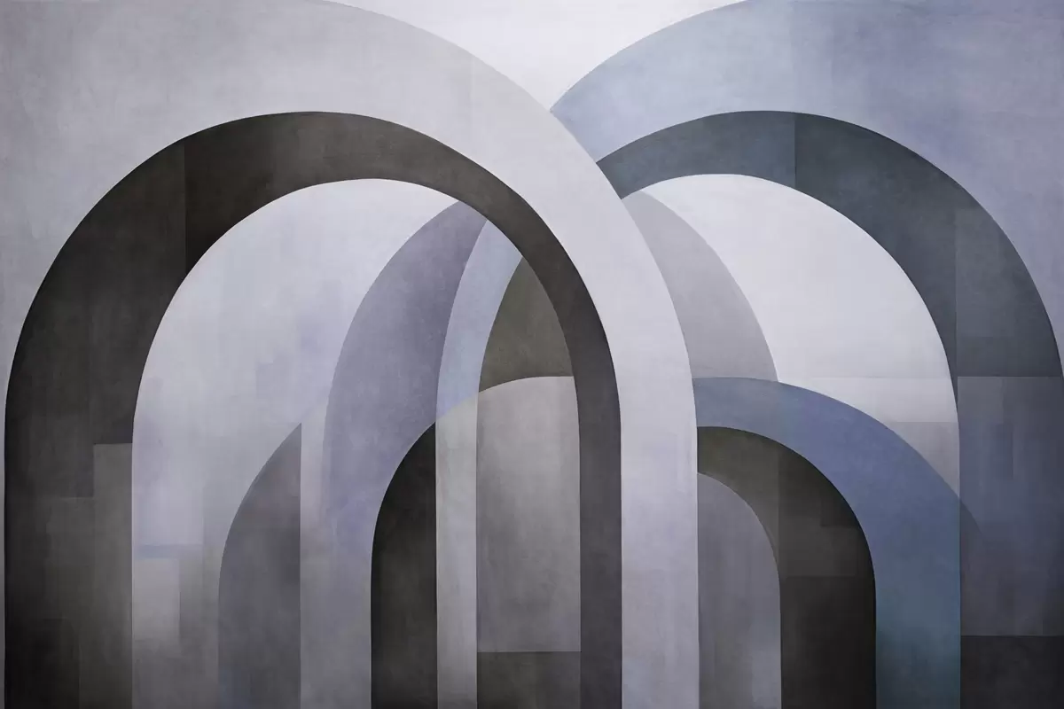 Fotomurales Arcos geométricos abstractos con textura en tonos azules, negros y grises, un diseño arquitectónico moderno en capas. Nr. w09611v1