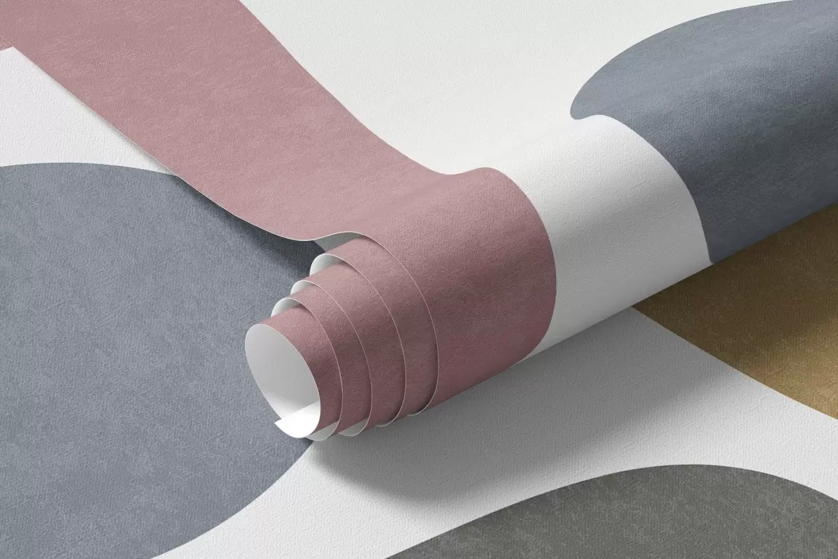 Fotomurales Formas abstractas con textura en rosa pastel, azul apagado, amarillo mostaza y gris sobre fondo blanco, arte moderno. Nr. w09620
