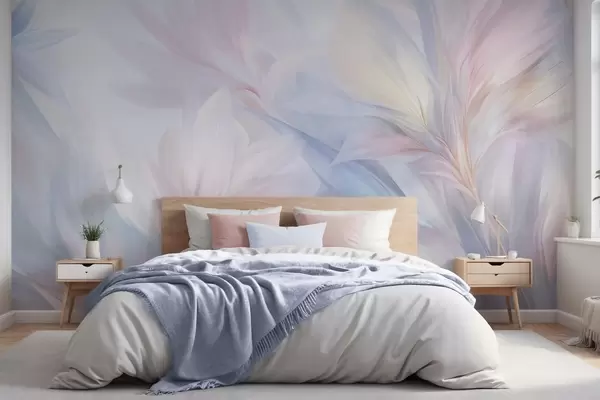 Fotomurales Hojas suaves en tonos pastel y plumas en tonos rosa, azul y amarillo, estampado abstracto y con textura. Nr. w09634