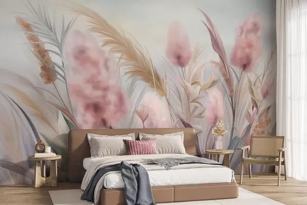 Fotomurales Hierba de la pampa rosa y beige y otras flores secas con un cielo suave y brumoso al fondo. Nr. w09635