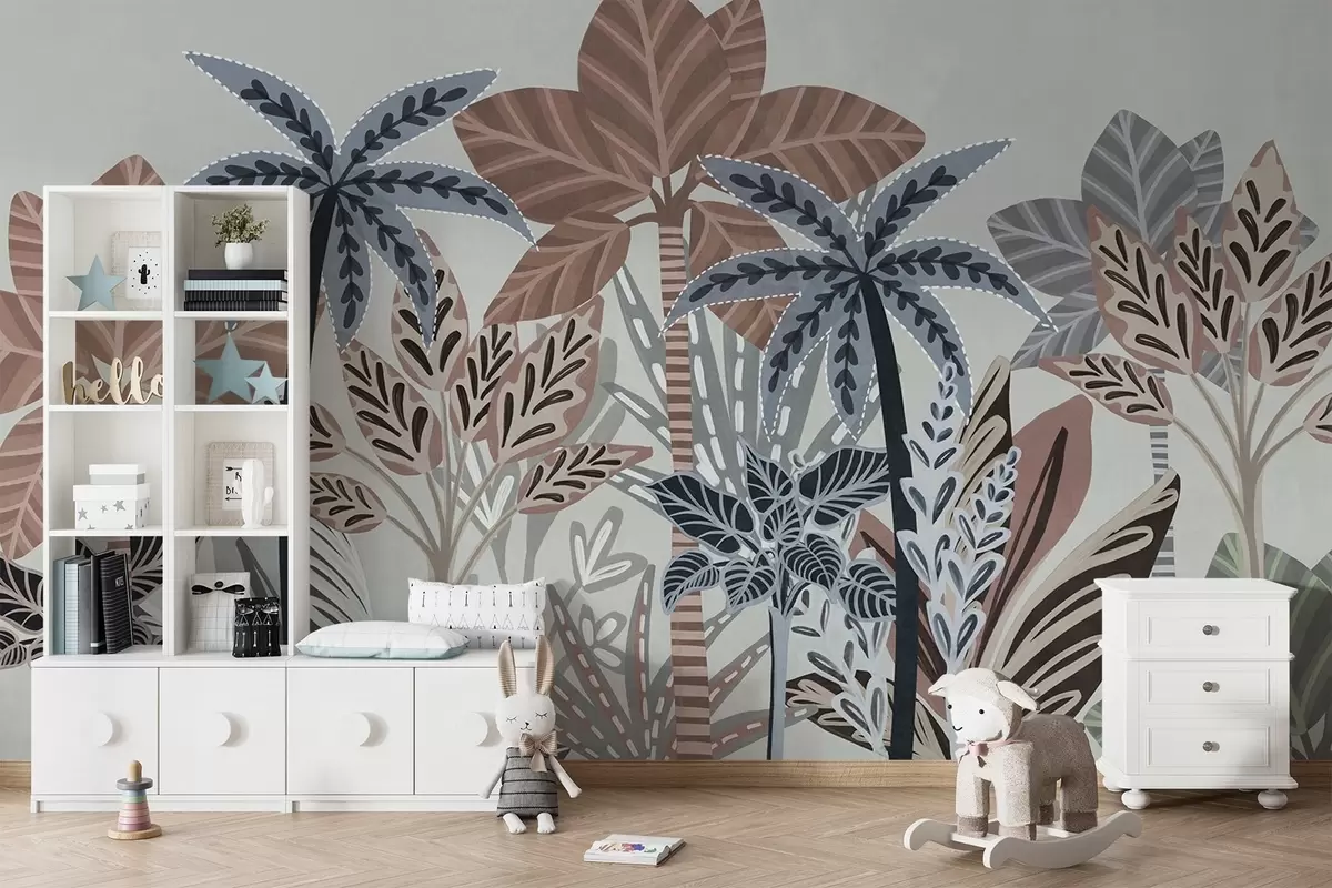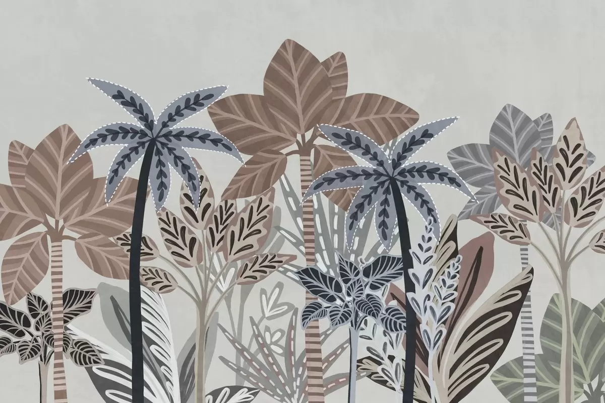Fotomurales Plantas tropicales y palmeras con textura y colores apagados en estilo boho decorativo sobre un fondo gris. Nr. w09639v1