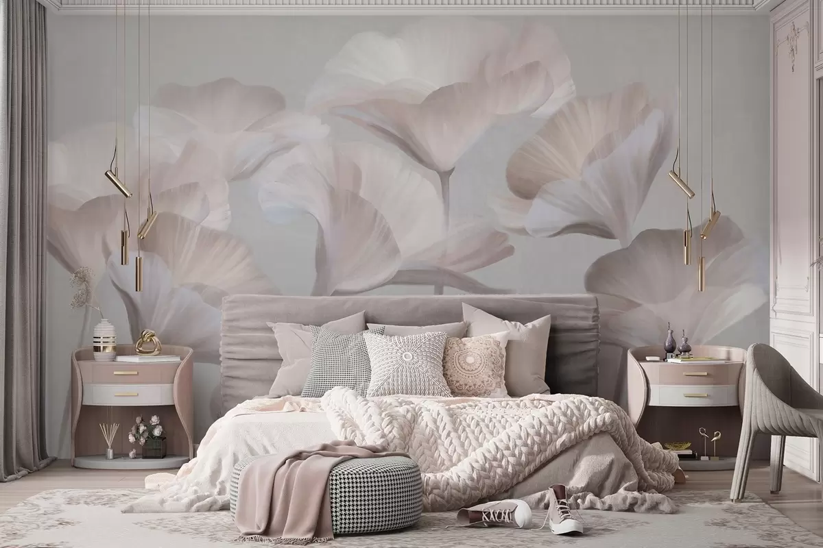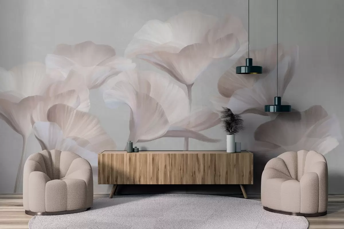 Fotomurales Flores de loto translúcidas con textura de melocotón pálido y delicados pétalos sobre un fondo gris apagado. Nr. w09640