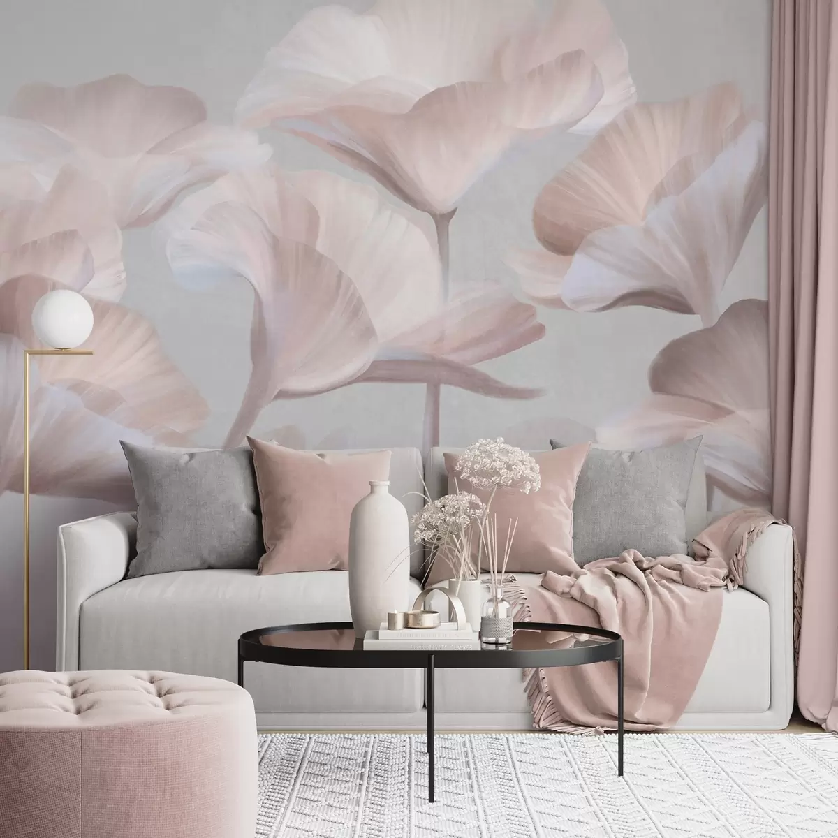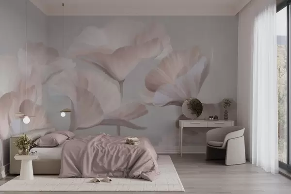 Fotomurales Flores de loto translúcidas con textura de melocotón pálido y delicados pétalos sobre un fondo gris apagado. Nr. w09640