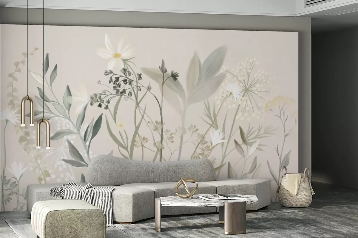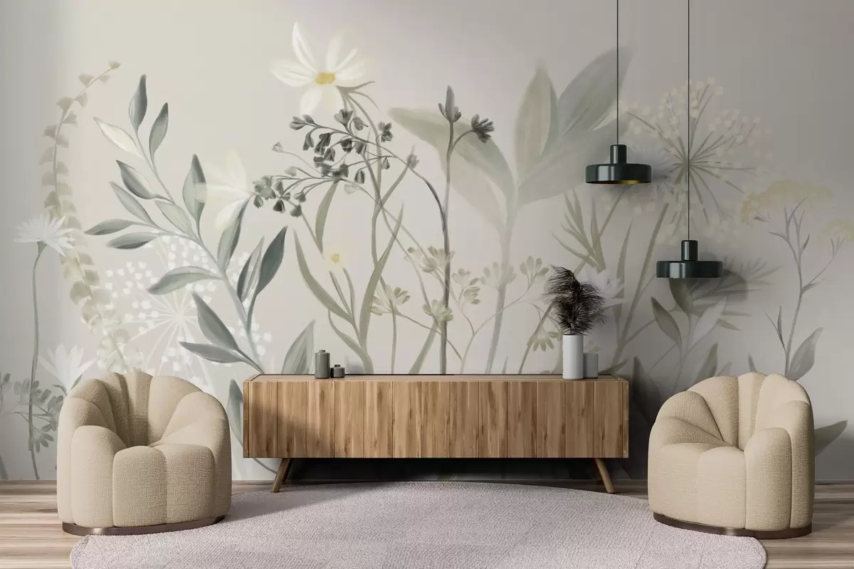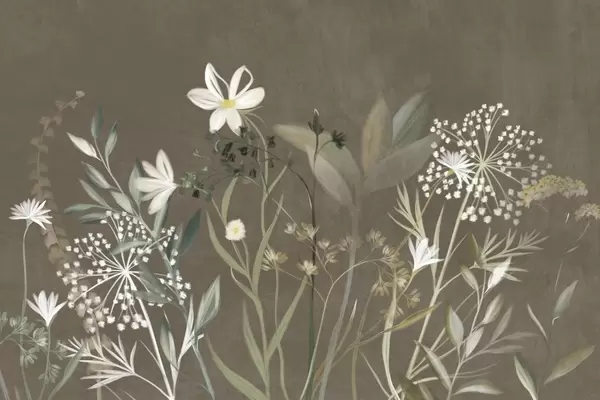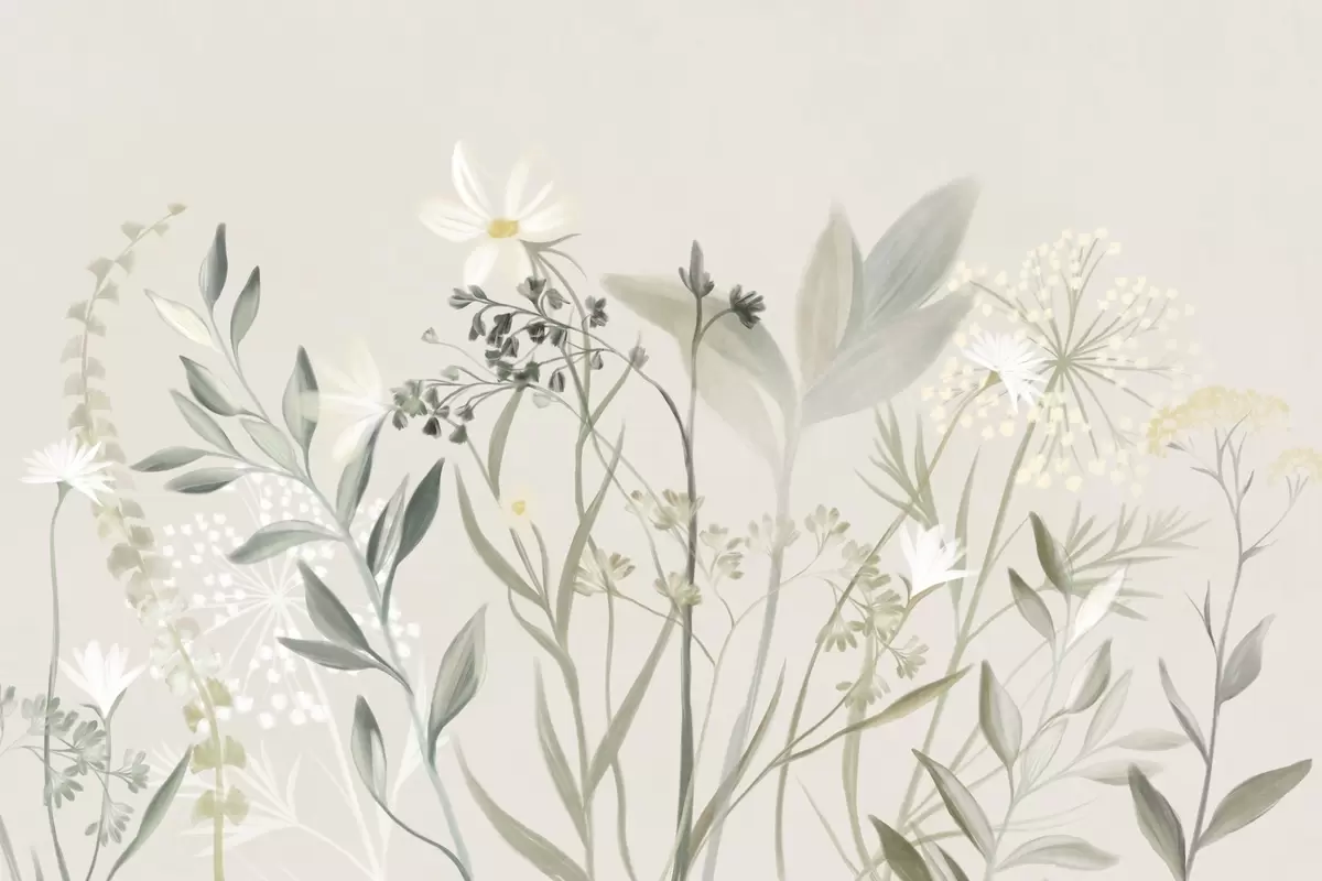 Fotomurales Delicadas flores silvestres y follaje con textura en tonos verdes y crema apagados sobre un fondo beige suave. Nr. w09641