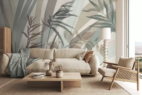 Fotomurales Hierba alta con textura y hojas en tonos tierra apagados, con líneas abstractas en el fondo, creando un estampado orgánico. Nr. w09643