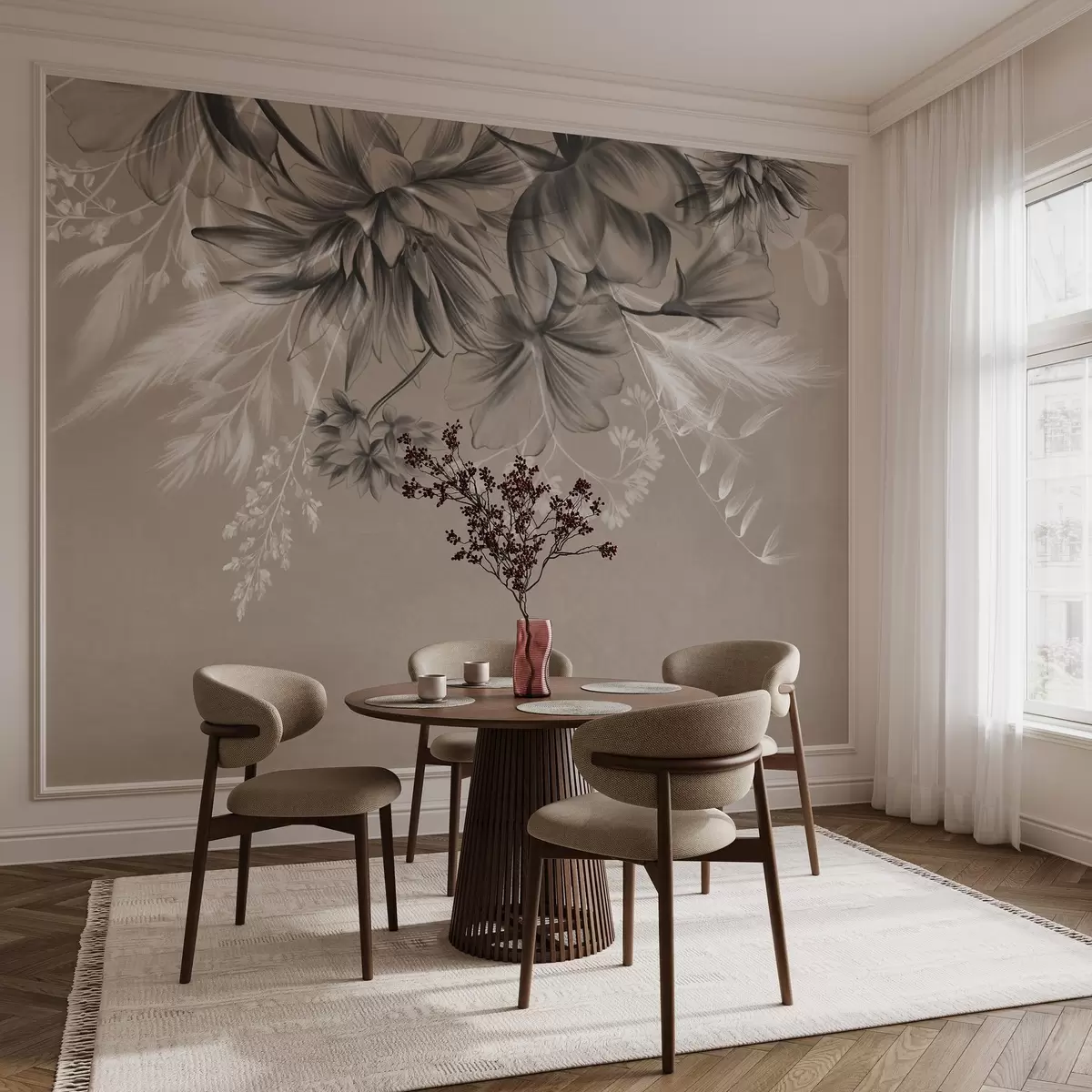 Fotomurales Flores y helechos texturizados en tonos gris oscuro y blanco sobre un fondo beige apagado, estilo de dibujo. Nr. w09644