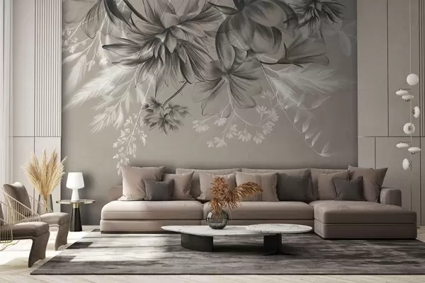 Fotomurales Flores y helechos texturizados en tonos gris oscuro y blanco sobre un fondo beige apagado, estilo de dibujo. Nr. w09644