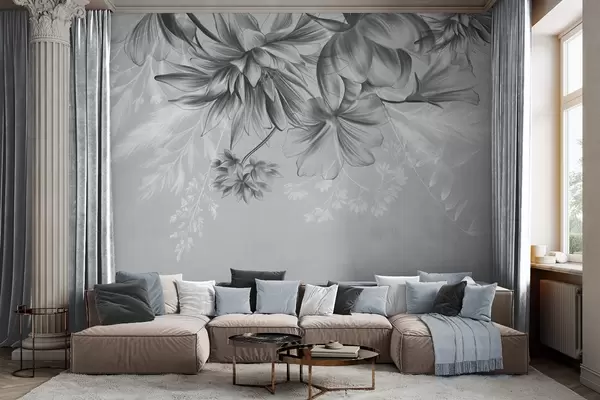 Fotomurales Flores y helechos texturizados en tonos gris oscuro y blanco sobre un fondo gris apagado, estilo de dibujo. Nr. w09644v1