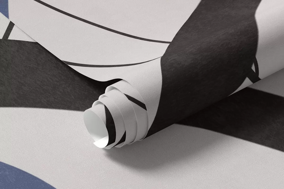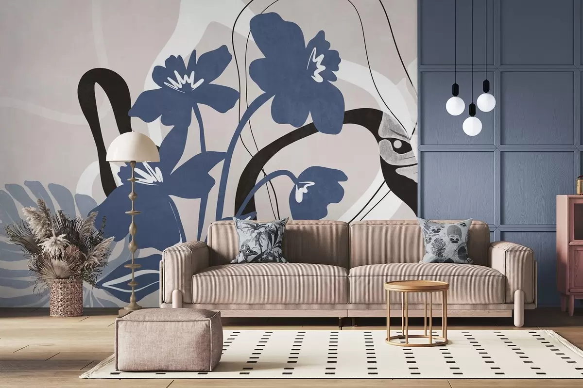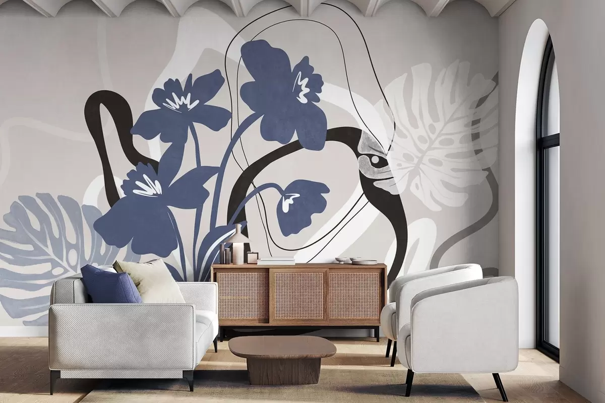 Fotomurales Flores azules abstractas con textura y formas blancas y negras sobre un fondo beige claro, arte minimalista. Nr. w09645