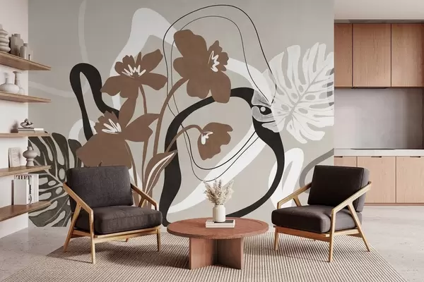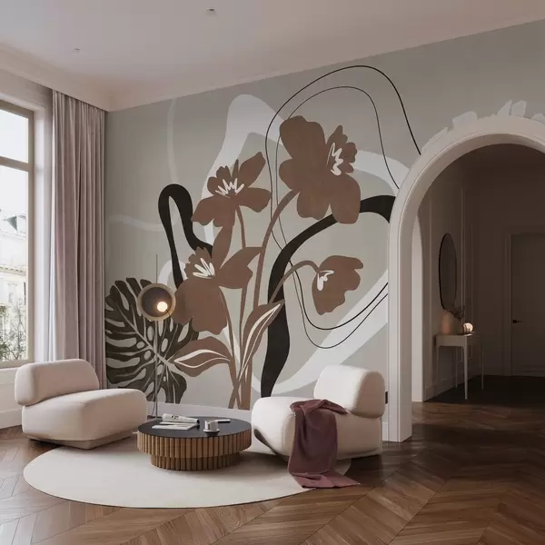 Fotomurales Flores marrones abstractas con textura y formas blancas y negras sobre fondo beige, arte minimalista. Nr. w09645v1