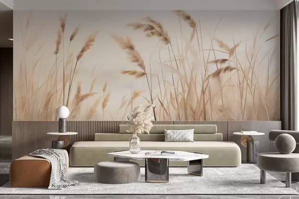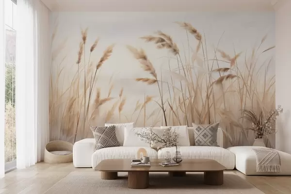 Fotomurales Hierba seca alta y texturizada con espigas de trigo en el campo sobre un fondo suave y pálido. Nr. w09648