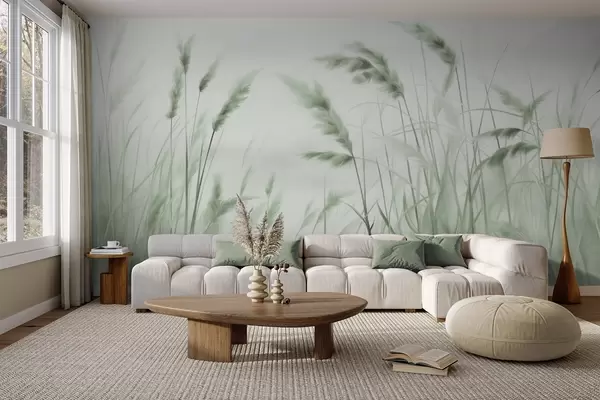Fotomurales Hierba seca alta y texturizada con espigas de trigo en el campo sobre un fondo suave y pálido. Nr. w09648v1