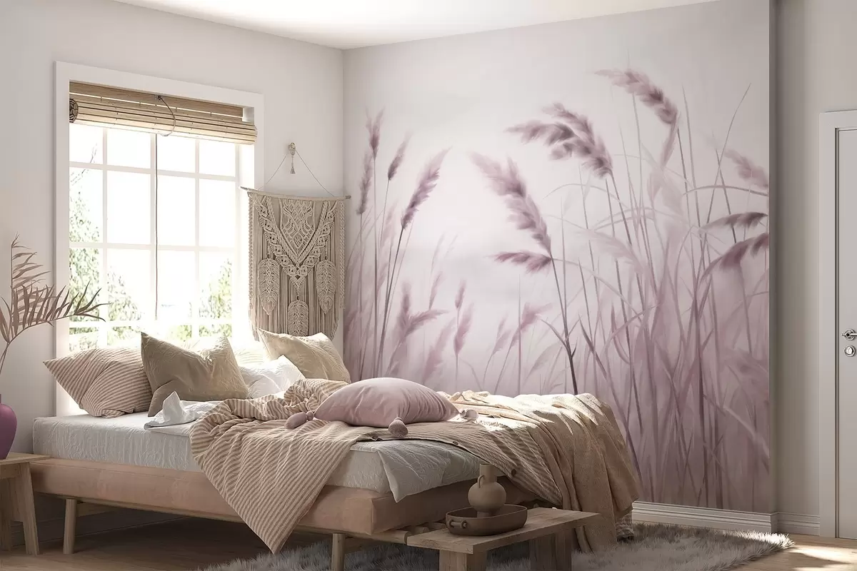 Fotomurales Hierba seca alta y texturizada con espigas de trigo en el campo sobre un fondo suave y pálido. Nr. w09648v2