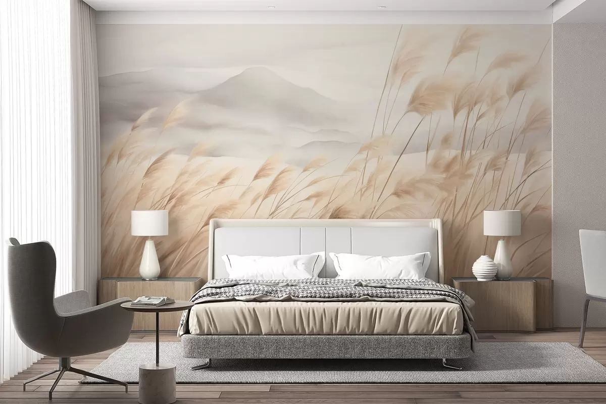 Fotomurales Paisaje montañoso con textura, con hierba alta y seca bajo un cielo brumoso. Nr. w09649