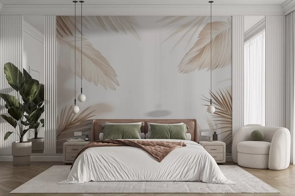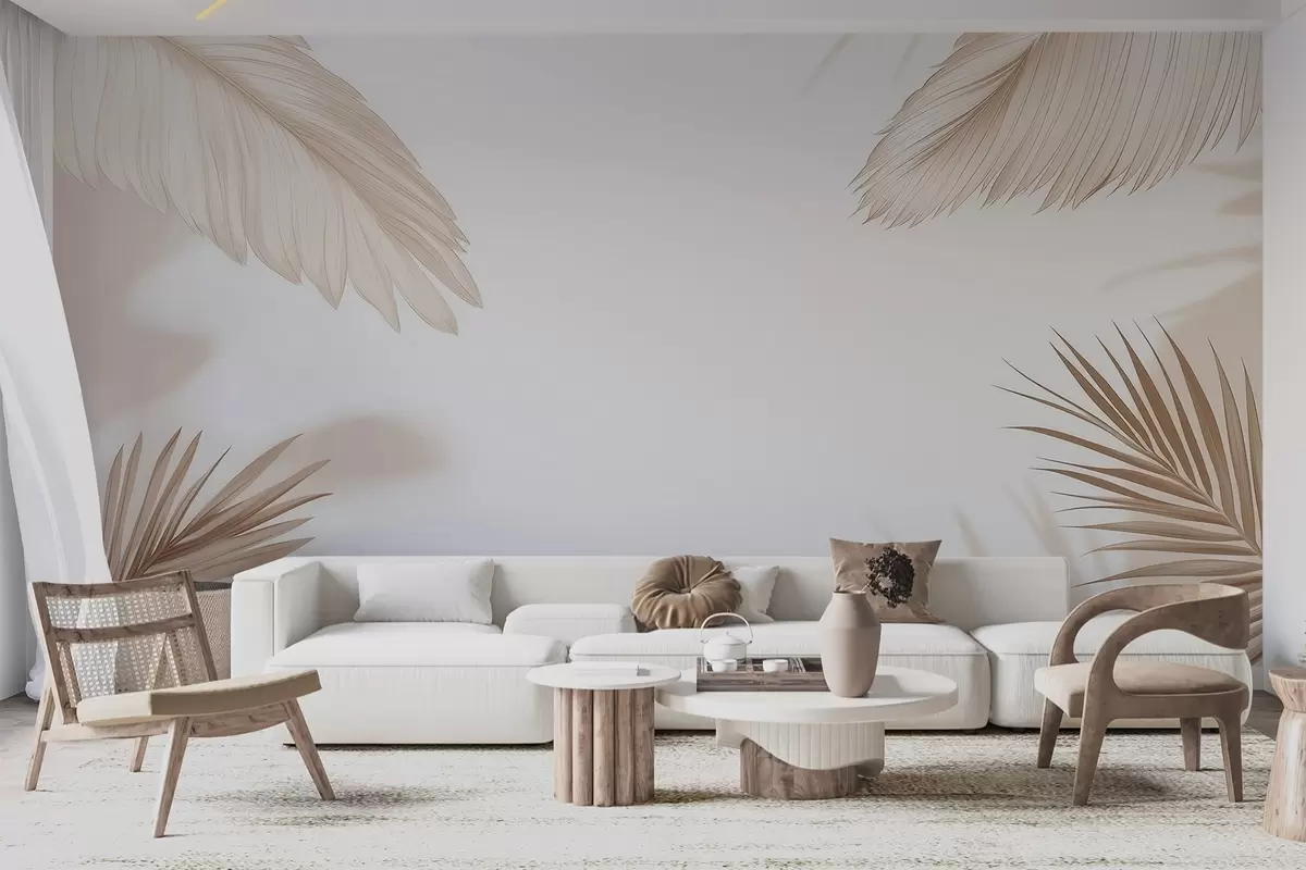 Fotomurales Decoración tropical en tonos beige con siluetas de hojas de palmera y sombras suaves Nr. w09714