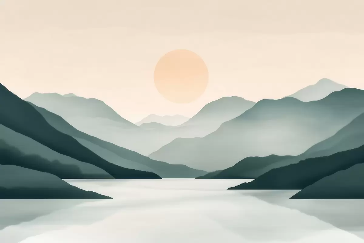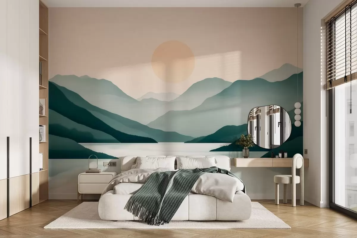 Fotomurales Tranquilo paisaje montañoso con el sol sobre el lago Nr. w09735