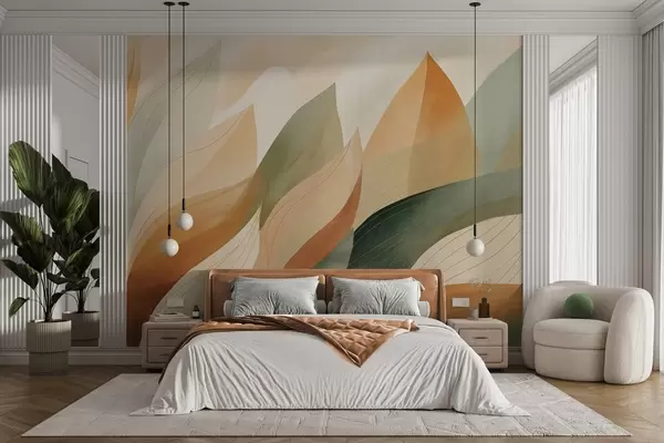 Fotomurales Hojas abstractas, tonos tierra apagados de verde y naranja con delicados detalles lineales, textura suave de acuarela. Nr. w09736