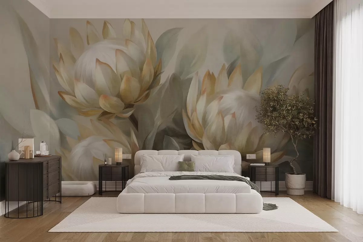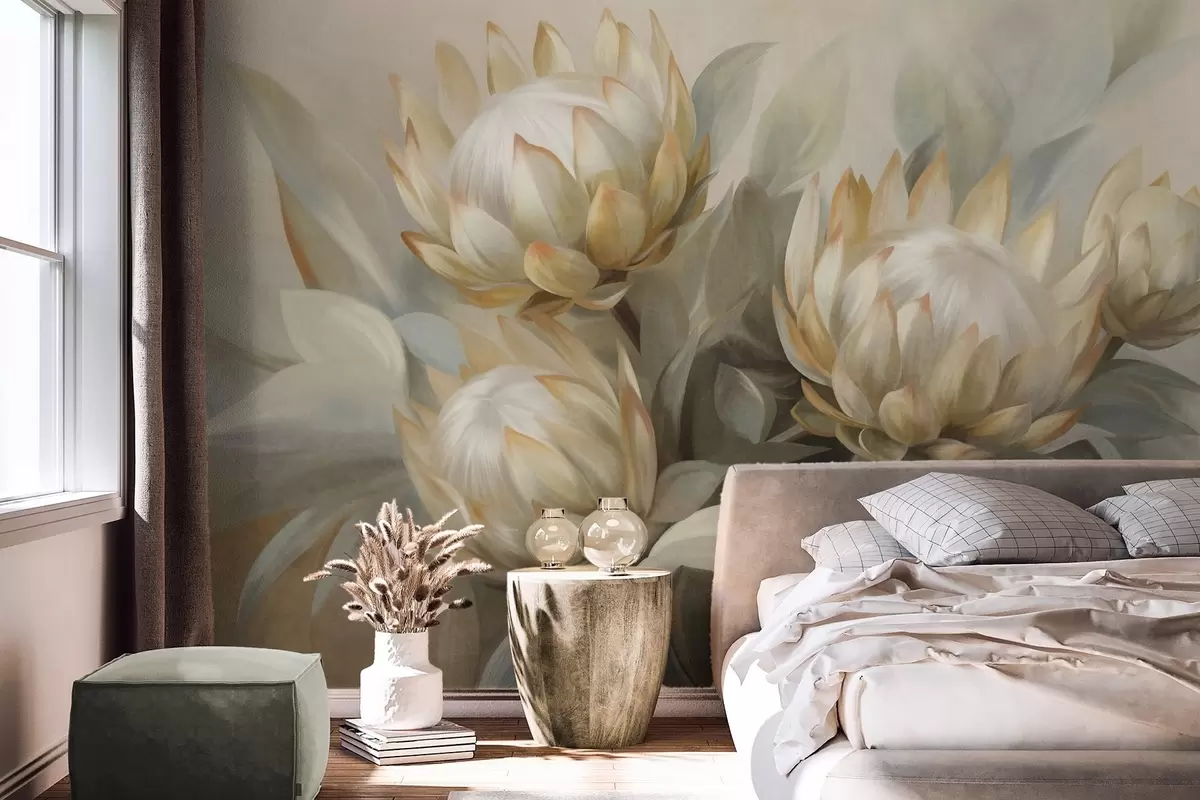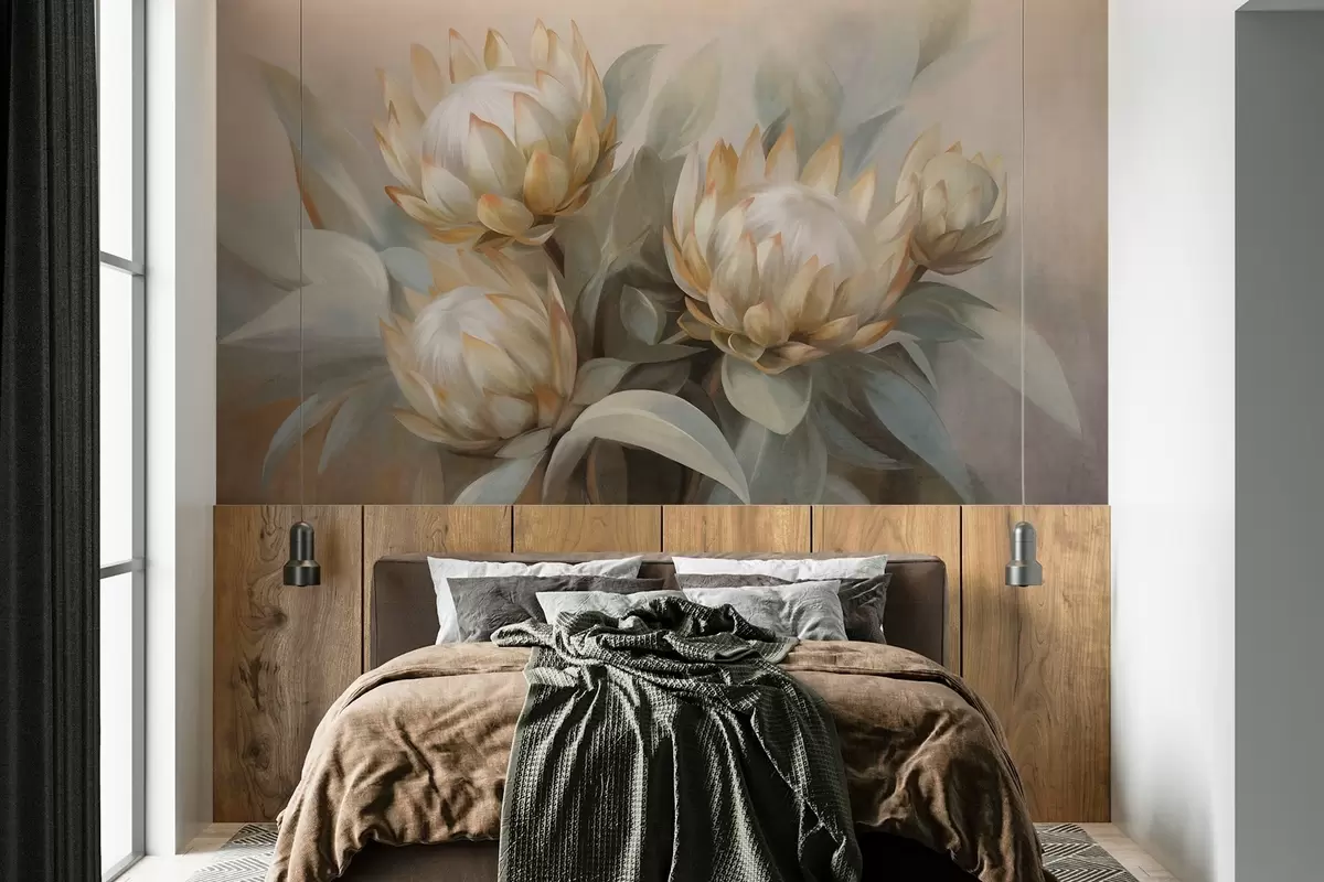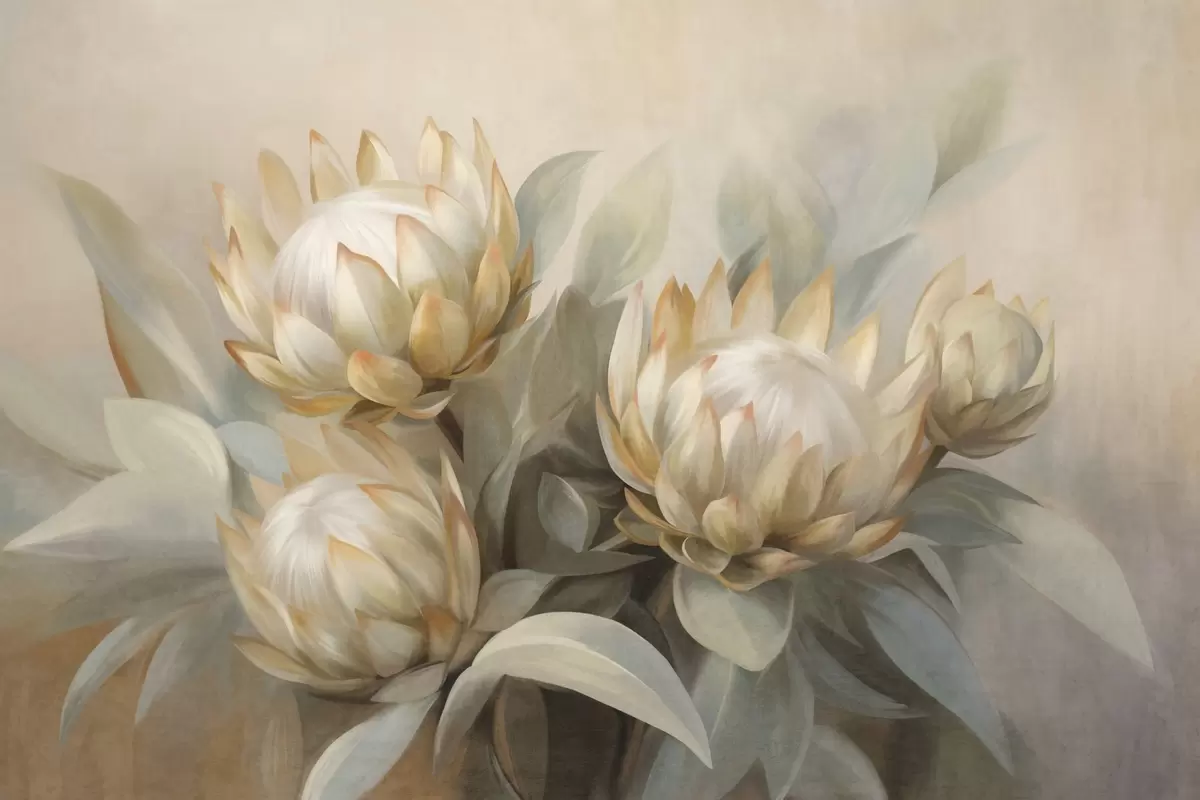 Fotomurales Flores de protea con textura, hojas verdes y un fondo suave y difuminado. Nr. w09738