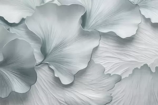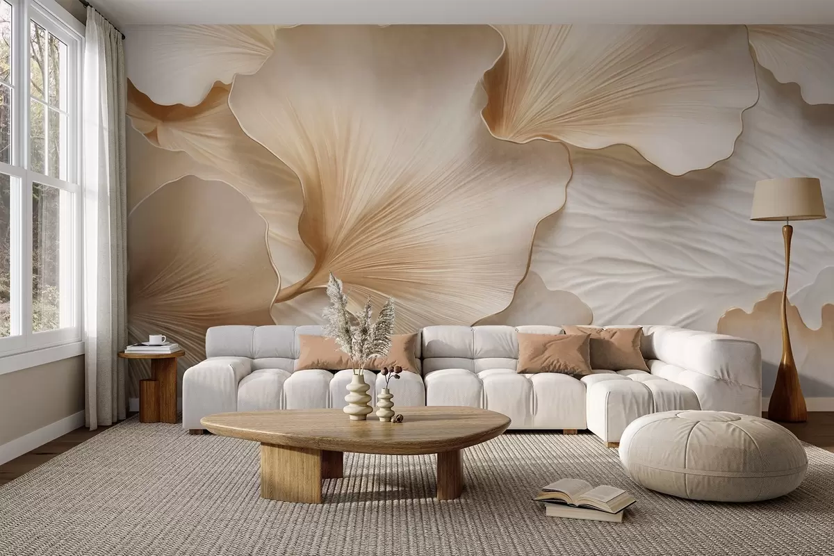 Fotomurales Pétalos de hojas de ginkgo texturizados, de color beige y blanco, con un delicado estampado orgánico. Nr. w09741