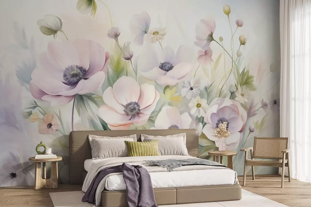 Fotomurales Un campo de flores de anémona en tonos rosa pastel y blanco, follaje verde y pequeñas margaritas blancas. Nr. w09742
