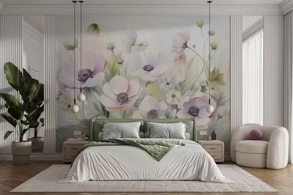 Fotomurales Un campo de flores de anémona en tonos rosa pastel y blanco, follaje verde y pequeñas margaritas blancas. Nr. w09742