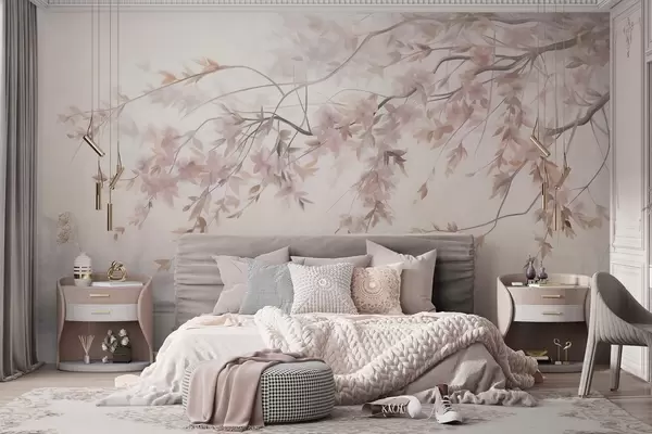 Fotomurales Paisaje texturizado con rama de cerezo en flor, hojas rosadas y fondo suave y brumoso. Nr. w09743