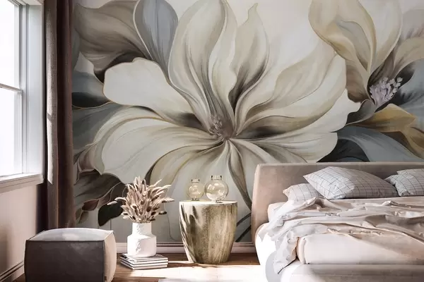 Fotomurales Grandes flores cremosas de magnolia con hojas marrones y grises, iluminación suave, fondo abstracto. Nr. w09749