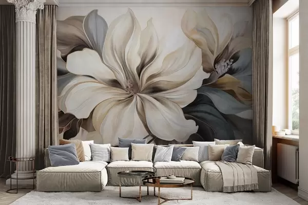 Fotomurales Grandes flores cremosas de magnolia con hojas marrones y grises, iluminación suave, fondo abstracto. Nr. w09749