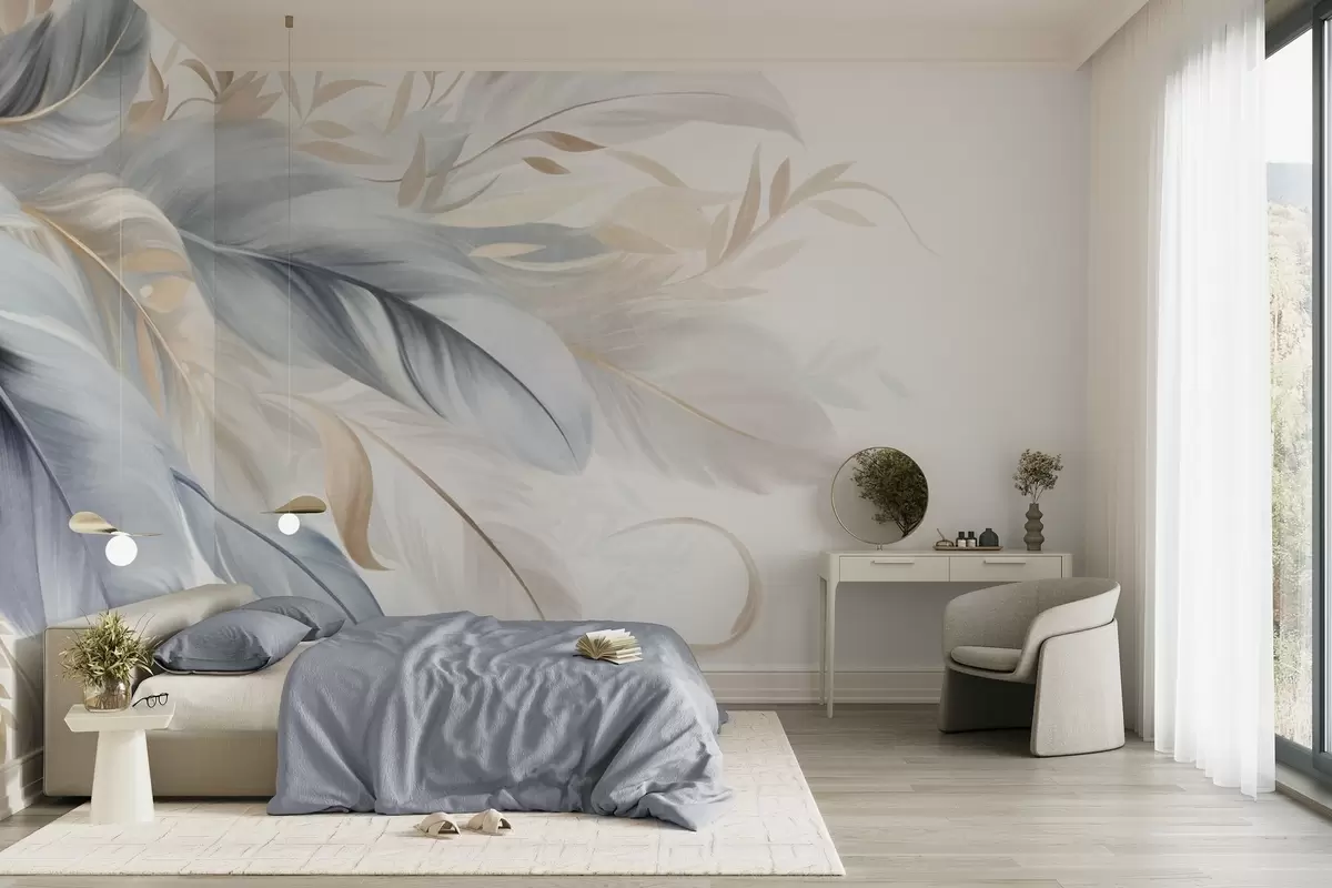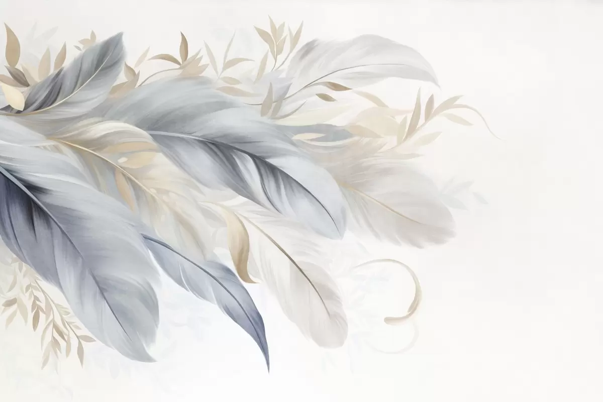 Fotomurales Plumas con textura en tonos pastel y delicadas hojas sobre un fondo claro Nr. w09763