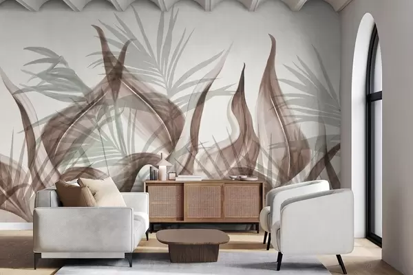 Fotomurales Hojas tropicales en tonos marrones y verdes sobre fondo blanco, estilo acuarela con textura. Nr. w09772